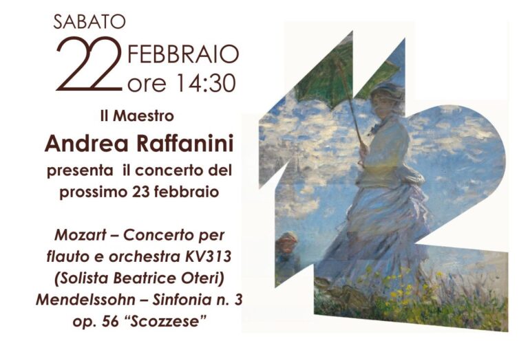 Con interessanti aneddoti e ascolto di alcuni passi, il Maestro ci aiuterà a comprendere le peculiarità del Concerto per flauto e orchestra KV313 di Mozart e della Sinfonia n. 3 op. 56 “Scozzese” di Mendelssohn.