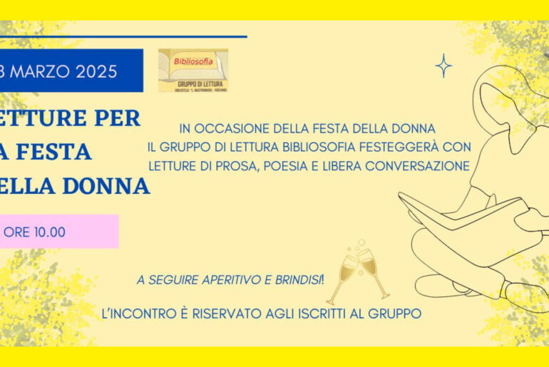Il Gruppo di Lettura Bibliosofia, per la giornata dedicata alla Festa della donna, propone un incontro nel quale le partecipanti leggeranno brani da loro scelti, oppure racconteranno qualcosa di inerente alla condizione e al ruolo femminile nel contesto socio culturale.
